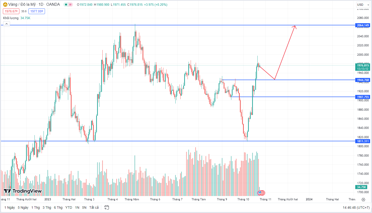 Tuy nhiên, quan trọng hơn là bài phát biểu của Chủ tịch Fed Powell tại Diễn đàn Kinh tế New York, nơi ông tránh cam kết về một hướng đi chính sách cụ thể khi trả lời câu hỏi của các phóng viên, nhưng không cho thấy ông ủng hộ việc tăng lãi suất. Powell nhắc lại rằng lạm phát vẫn quá cao và nhấn mạnh dữ liệu tháng 9 không khả quan cho lắm. Tuy nhiên, ông chỉ ra rằng hiệu ứng của chính sách tiền tệ đang bắt đầu xuất hiện và cần thời gian để phát huy tác dụng. Thông điệp ôn hòa của Powell đã khiến các nhà đầu cơ trên thị trường đặt cược vào đồng USD yếu đi, thúc đẩy đà tăng của vàng cùng với tâm lý hoảng loạn.