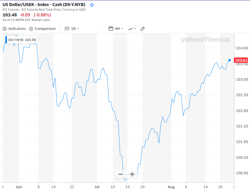 Bài viết tháng trước có đề cập rằng các nền tảng cơ bản của nền kinh tế Mỹ vẫn duy trì đà tăng trưởng tốt, nhưng xu hướng kỹ thuật thì rơi xuống dưới mức hỗ trợ trước đó tạo đáy thấp hơn hơn 100,50 lần, điều này có thể kích hoạt một đợt giảm giá. Tuy nhiên, đồng USD bắt đầu phục hồi mạnh mẽ sau khi rơi xuống khoảng 99,30, từng tăng lên 103,60 và các đồng tiền không phải USD giảm sâu. Trong những tháng gần đây, thị trường ngoại hối cơ bản không chịu ảnh hưởng bởi các yếu tố mới đặc biệt. Tổng thể vẫn được thúc đẩy bởi dữ liệu kinh tế, lạm phát và thái độ chính sách tiền tệ của ngân hàng trung ương. Như tôi đã nói trước đó, các nền tảng của Mỹ vẫn chiếm ưu thế. Mặc dù thị trường lao động có dấu hiệu chậm lại nhưng chưa suy yếu đáng kể. Ngược lại, tăng trưởng tiền lương vẫn mạnh và thị trường tiêu dùng sôi động. Điều này có thể thấy từ việc doanh số bán lẻ tháng 7 tăng 0,7% so với tháng trước. Kết quả là lạm phát có thể chỉ giảm chậm. Quan trọng hơn, Fed dường như lạc quan hơn về triển vọng kinh tế so với trước đây, và ít có khả năng đề cập đến nguy cơ suy thoái, nhưng lo ngại nền kinh tế sẽ tăng tốc trở lại. Từ biên bản cuộc họp mới nhất, có thể thấy lập trường chính sách tiền tệ của nhiều quan chức trong cơ quan có dấu hiệu diều hâu. Tất cả những điều trên có tác động tích cực đến đồng USD, cộng với thiếu các yếu tố tiếp sức mới trên thị trường, và thiếu tin tốt trong các nền kinh tế khác, đồng USD đã tiếp tục tăng sau khi quay trở lại mức 101.
